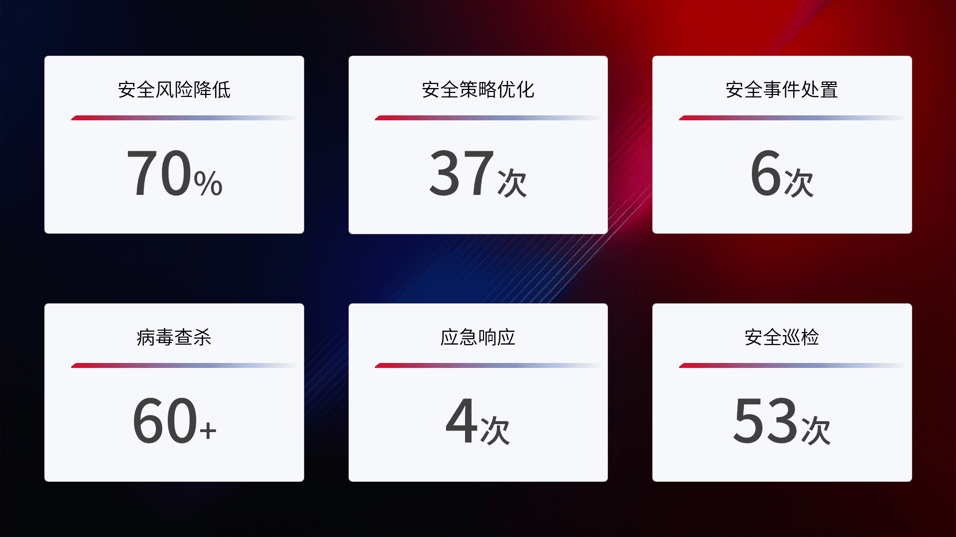 提供全面的安全事件报告体系,,,包括处置报告、、周报、、、季度和年度总结,,,结合持续监控,,,帮助客户深入了解网络安全状况。。。