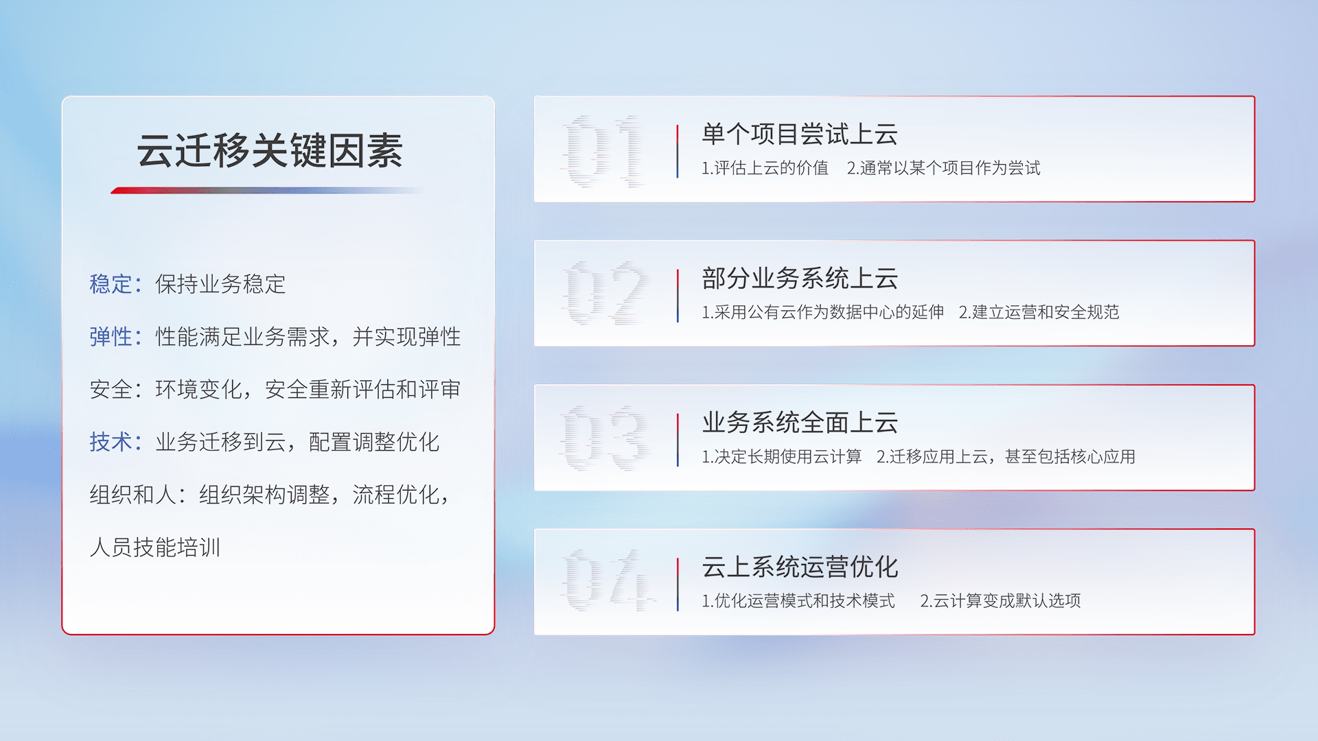 结合实际业务,,,,从规划设计、、、、云平台选型、、云原生改造、、、数据迁移、、集成交付,,,迁移全过程为客户识别最佳上云路径,,做好风险识别管理,,,,设计网络架构、、、身份权限、、安全审计合规、、、、操作审计、、日志审计、、监控告警策略、、、、多站点容灾设计等,,,,对云上基础设施进行整体规划,,,提升IT治理水平,,,以满足弹性、、、高可用、、、高性能的需求。。。。