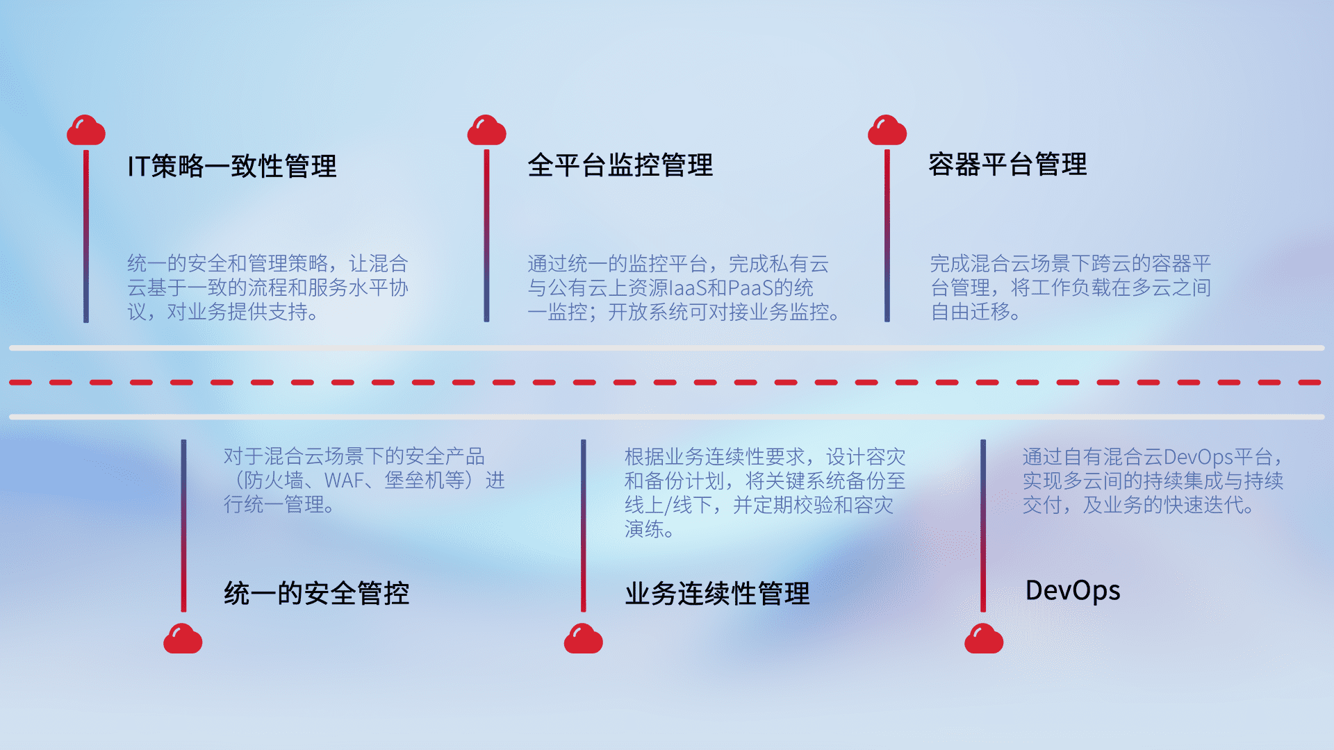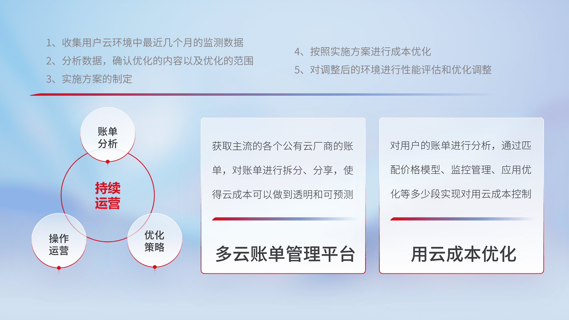 通过多云纳管,,,,以统一的资源数据模型把客户的云资源进行抽象和封装,,进而实现对多云资源的统一操作,,,,保障云资源管理的可靠性、、、、稳定性与可用性。。。。量身定制化运维内容,,,配置、、开发运维、、、补丁管理、、、、备份、、、、监控、、、认证和访问管理、、、审计和日常巡检等,,,,保障在用云过程中的可靠度,,,,稳定度以及高可用率。。。。