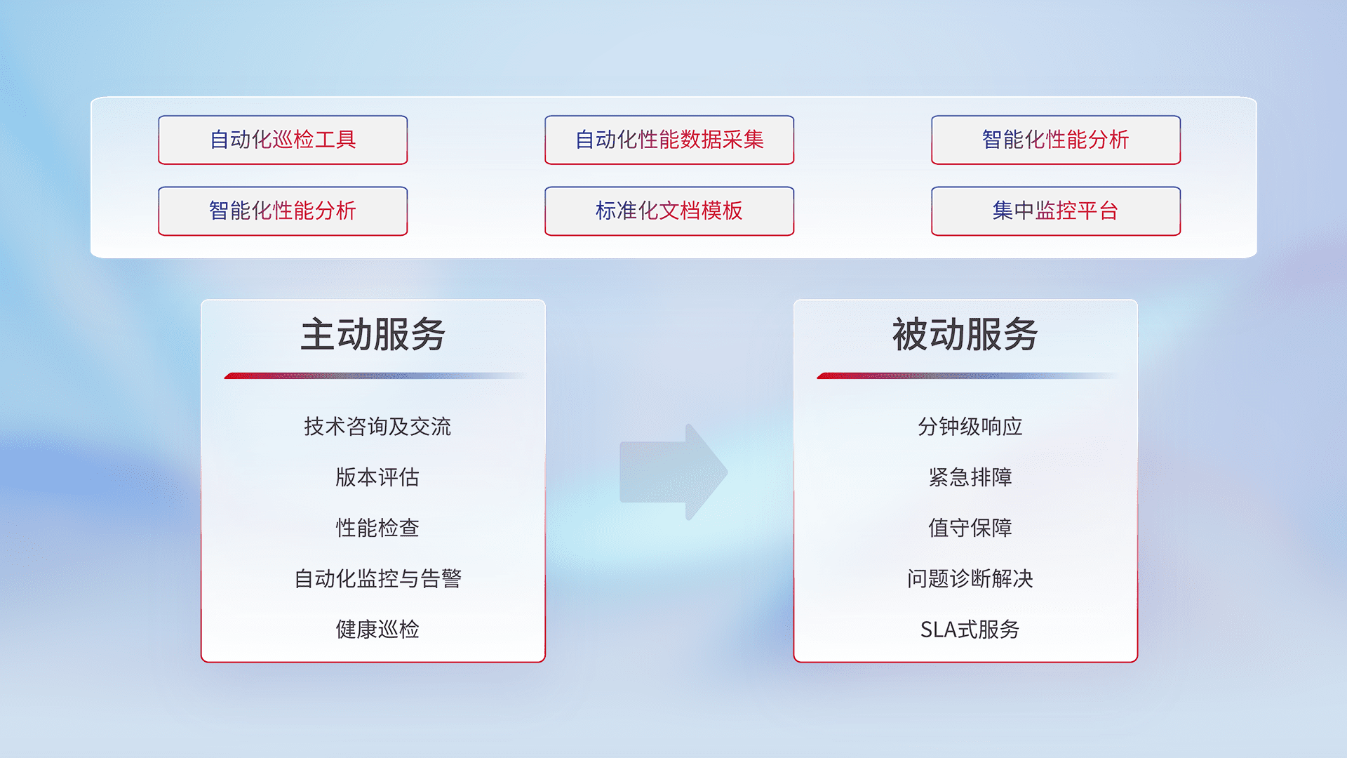 智能化工具和标准化文档,,,,保障服务质量,,提供主动服务(包含技术咨询、、、版本评估、、、、性能检查、、、、自动化监控与告警、、健康巡检)和被动服务包含(分钟级响应、、、紧急排障、、、、值守保障、、、、问题诊断解决、、SLA服务)。。。